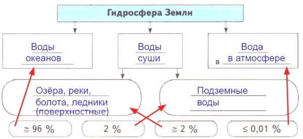 Стрелками укажите, какую долю от общего объёма гидросферы составляют её части.