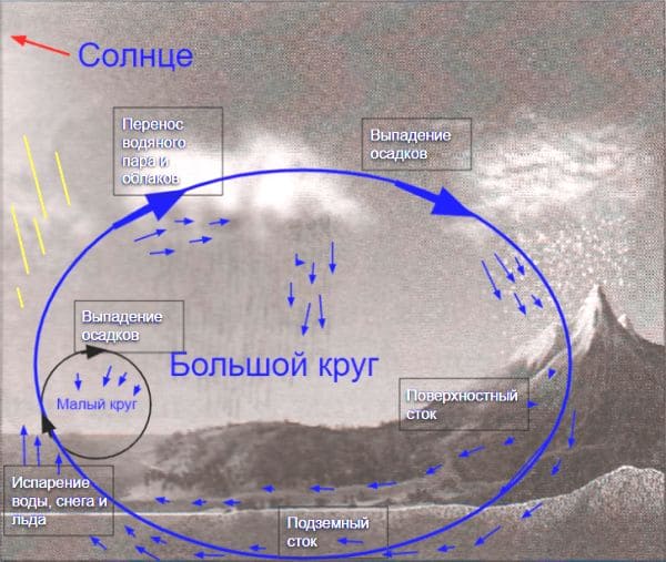 Круговорот воды объединяет оболочки Земли − атмосферу, биосферу, литосферу и гидросферу, так как вода входит в каждую из них.